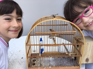 Eis que um belo dia nosso amigo Ivan, vendedor de roletas (casquinhas doces) no caminho da escola perguntou se podia dar um passarinho para elas. O radar da Marina, sempre ligado, captou a conversa começou a me questionar, se elas iriam mesmo ganhar um passarinho. Apesar de não aprovar passarinho em gaiola, acabei concordando, e alguns dias depois, o Ivan não deu apenas 1 passarinho, mas 4!!!! 2 casais, e tive que providenciar mais uma gaiola para dar mais privacidade a cada dupla.